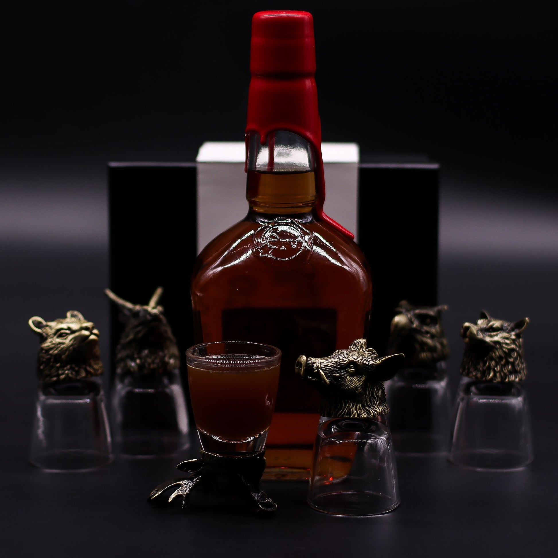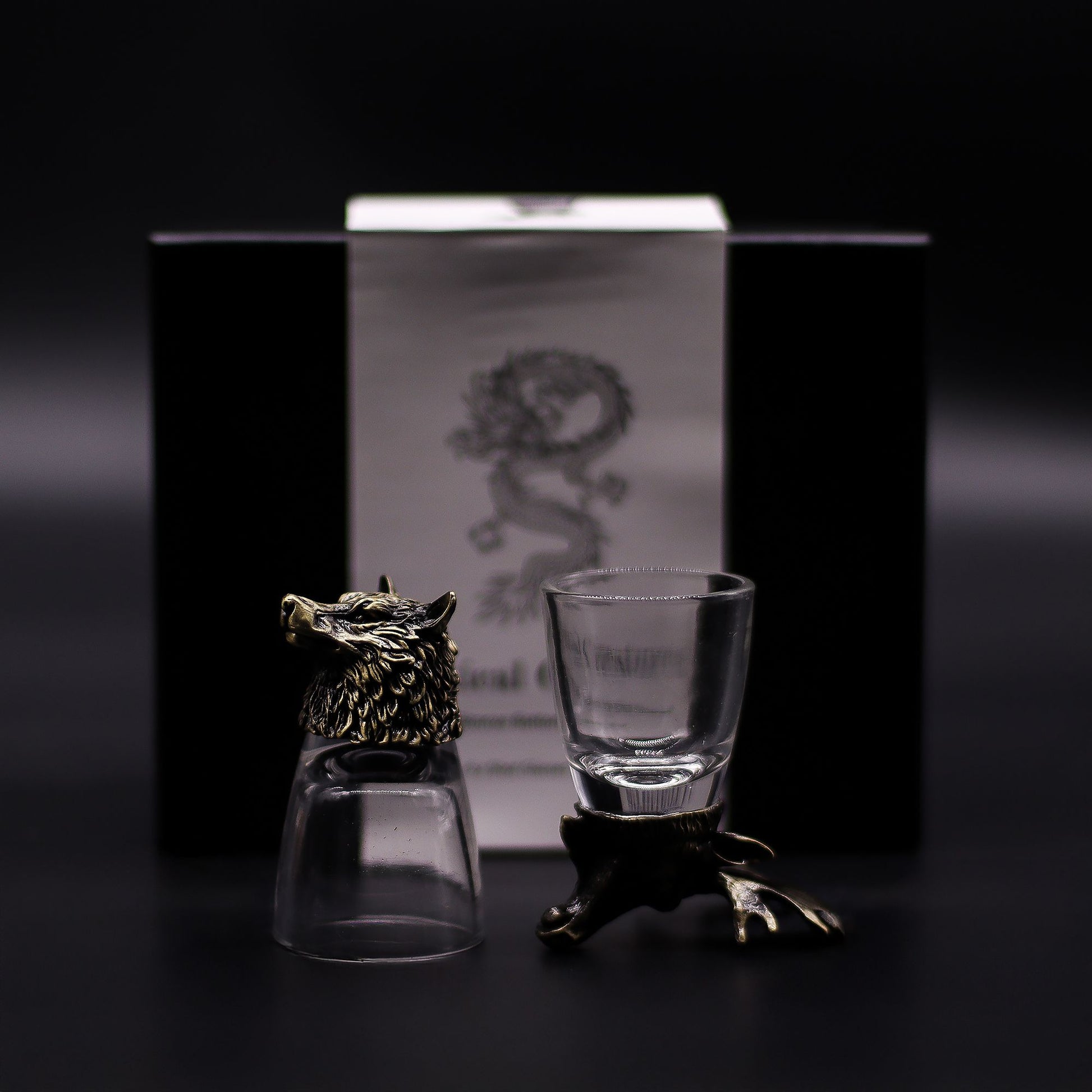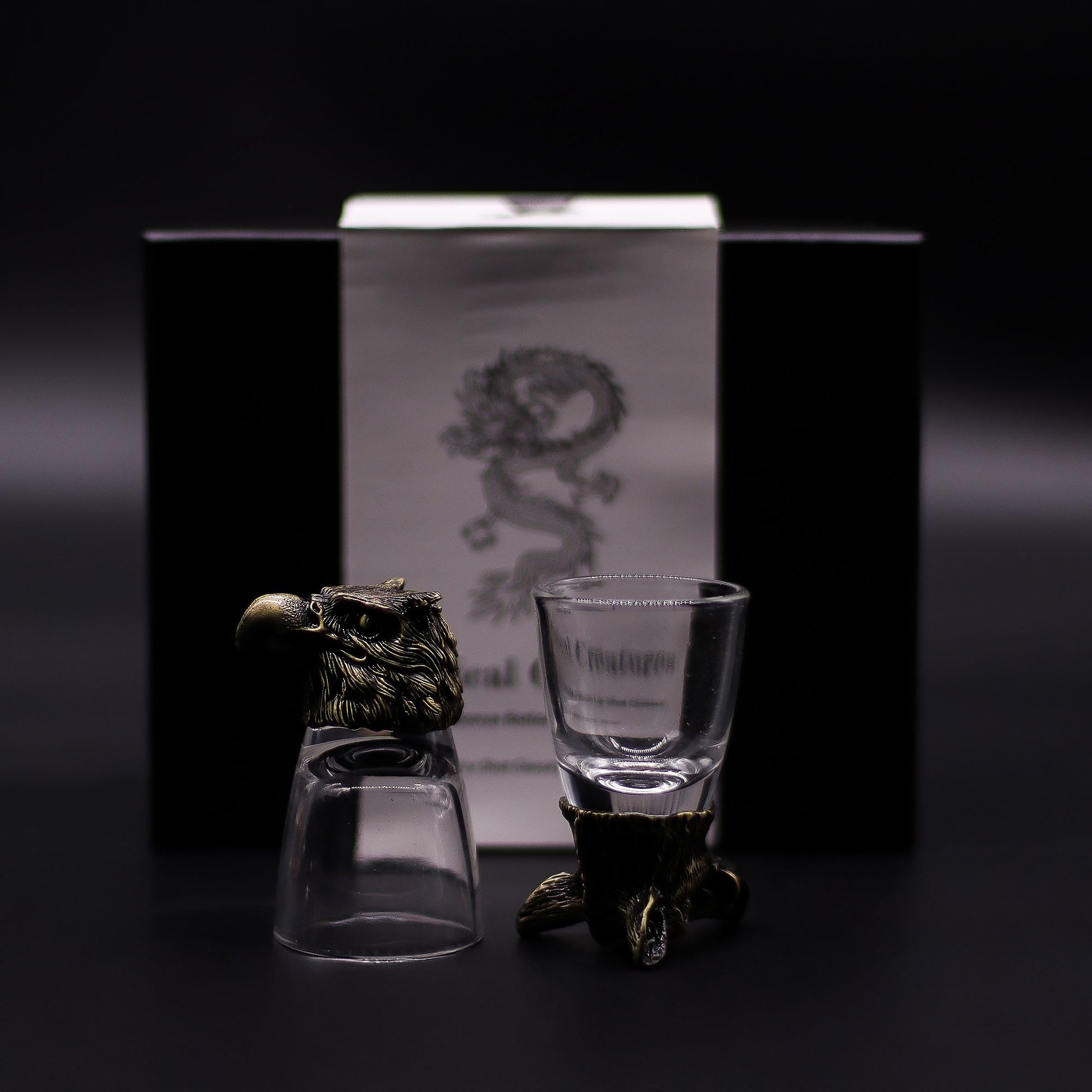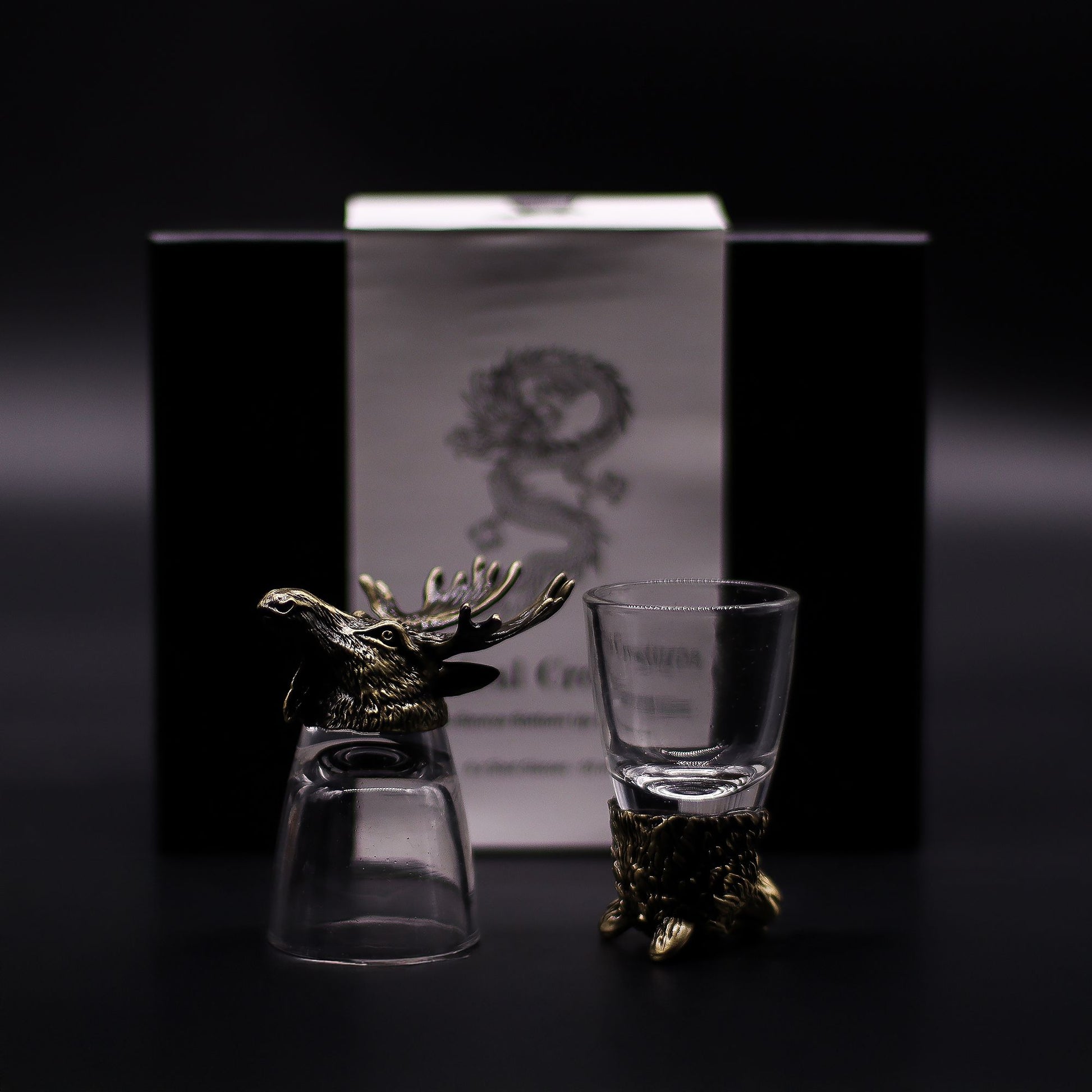 Each glass features a clear vessel resting on an ornate antique-style metal alloy base, showcasing iconic animals of the wilderness: the Bear (strength), Wolf (loyalty), Goat (resilience), Eagle (vision), Moose (endurance), and Boar (determination). Their detailed design and larger size make them ideal for gifting, collecting, or enhancing home bar displays.